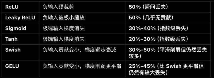 下表是常见激活函数的信息丢失比例: